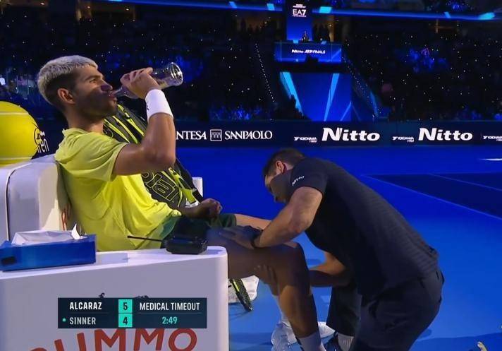 这场比赛第一盘第九局结束,率先发球的阿尔卡拉斯5:4领先,局间休息的时候,阿尔卡拉斯申请了医疗暂停,赛事防护员进场,为阿尔卡拉斯的右大腿进行了按摩。第一盘抢七告负之后,阿尔卡拉斯再次申请了医疗暂停,赛事防护员再次进场,为阿尔卡拉斯右大腿进行按摩,并缠上了厚厚的绷带。