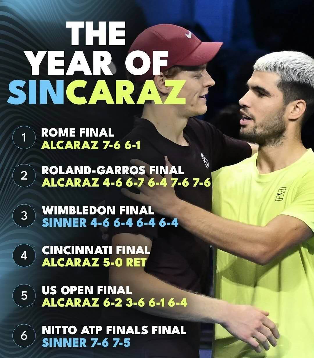 现在回过头去看,阿尔卡拉斯在上周ATP年终总决赛最后的决赛中带伤作战,怎么可能“影响不算太大呢?”两个一生之敌,年度最后一战,胜负本来就在伯仲之间,因此任何一个微小细节,都有可能影响两人在关键分上的表现,让比赛走向和结果发生倾斜和变化,更何况有一方是带伤作战呢?