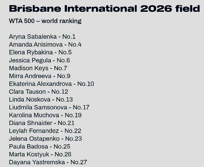 WTA500布里斯班站:世界第一、卫冕冠军萨巴伦卡领衔,阿尼西莫娃、莱巴金娜、佩古拉、凯斯、米拉-安德列娃、亚历山德洛娃等名将新星都榜上有名。前赛会冠军、捷克名将卡-普利斯科娃的名字也出现在参赛球员名单中。这项赛事将于明年1月4日--11日进行。